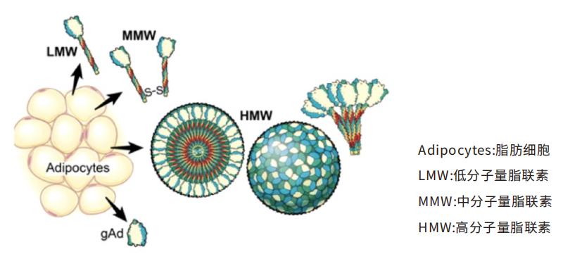 2、通過自身結構域形成多聚體形式,與脂聯(lián)素受體結合發(fā)揮作用