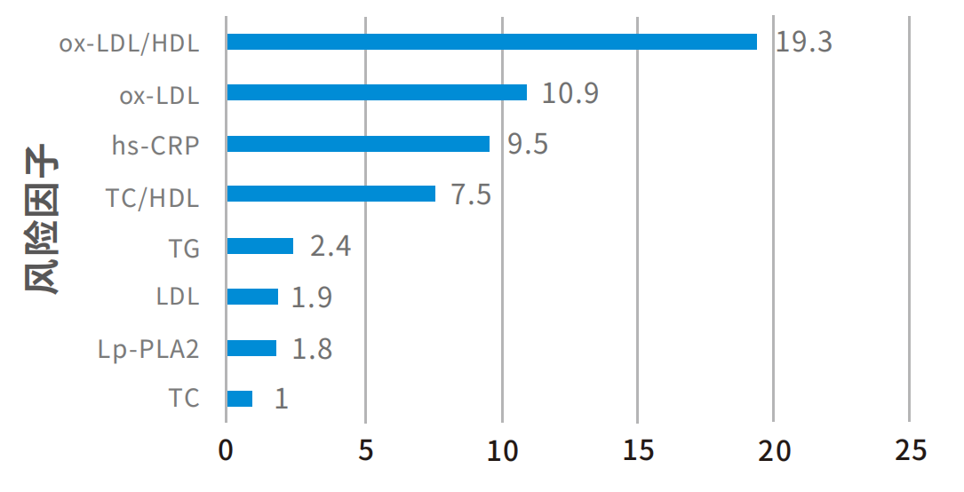 如將TC對心血管疾病的診斷的有效性定義為1,則ox-LDL為10.9,ox-LDL/HDL為19.3,ox-LDL檢測有效性明顯提升。