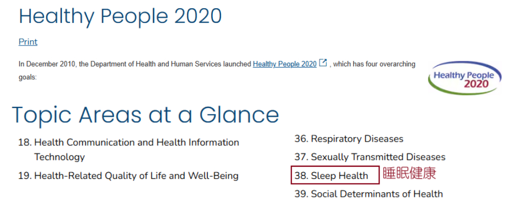 在2020年,睡眠健康被納入為美國衛(wèi)生與公共服務部所頒布《Healthy People 2020》的42個主題之一,用于指導全民健康和疾病預防實踐,以改善美國國民健康的10年目標規(guī)劃。
