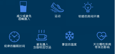 除此之外避免睡前飲用含有咖啡因的飲料、減少酒精攝入、設置適宜的溫度(16℃~21℃)等都有助于睡眠改善。對于患有糖尿病、心血管、精神類以及呼吸系統(tǒng)等疾病的患者,應結合治療一同進行改善。