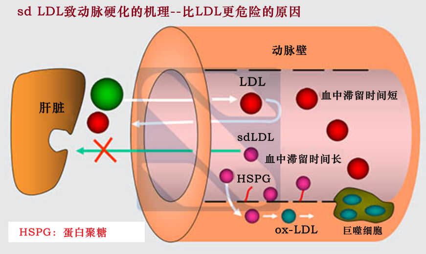 4)易粘附:體外研究發(fā)現(xiàn)sdLDL易與血管壁上的蛋白多糖結(jié)合,從而粘附在血管壁上。如果發(fā)生在體內(nèi),則粘附的sdLDL很可能通過某種途徑進入人血管內(nèi)皮細胞,在細胞多種氧化酶的作用下,sdLDL在血管壁內(nèi)發(fā)生氧化修飾,從而誘發(fā)動脈粥樣硬化、冠心病等多種疾病的發(fā)生。