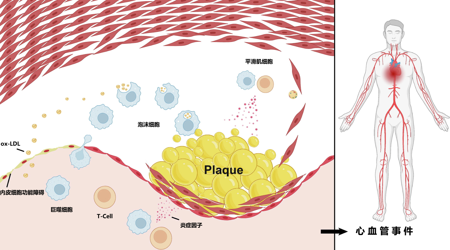動脈粥樣硬化是一個復(fù)雜的病理生理過程,由代謝紊亂、脂質(zhì)積累和炎癥驅(qū)動。雖然在早期臨床上可能無癥狀,但動脈粥樣硬化病變通常會轉(zhuǎn)化為易破裂的脆弱斑塊,并引發(fā)隨后的不良事件,包括心肌梗死、中風(fēng)和死亡。