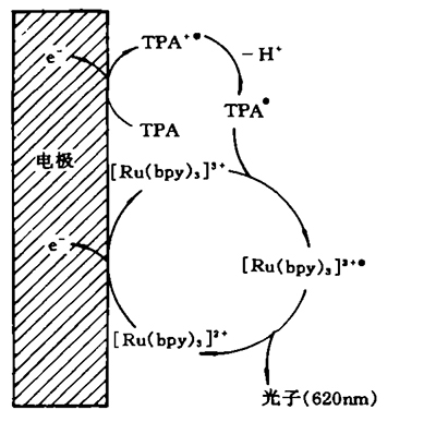 [Ru(byp)3] 2+,三丙胺(TPA)用來激發(fā)光反應。在陽極表面,兩種物質(zhì)同時失去電子。在電極板上[Ru(byp)3] 2+被氧化成[Ru(byp)3] 3+,TPA也被氧化成陽離子自由基(TPA+. ),(TPA+. )自發(fā)地釋放一個質(zhì)子而變成非穩(wěn)定分子(TPA.),將一個電子遞給[Ru(byp)3] 3+,形成激發(fā)態(tài)的[Ru(byp)3] 2+.。[Ru(byp)3] 2+.在衰減的同時發(fā)射一個波長為620nm的光子,重新回到基態(tài)[Ru(byp)3] 2+。這一過程在電極表面反復進行,產(chǎn)生高效、穩(wěn)定的連續(xù)發(fā)光,并不斷增強。