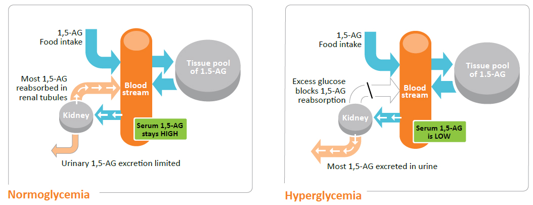 體內(nèi)1,5 - AG主要來源于食物,正常人每天平均從食物中獲得5 - 10mg,食入后通過小腸迅速吸收,吸收后經(jīng)過血液循環(huán)分布于各組織、臟器。從食物中攝入的1,5 - AG會從尿液中排出,攝入的1,5 - AG與尿排出的1,5 - AG形成了一個平衡,且其日吸收量與日排量成正比。在體內(nèi)1,5 - AG有一個龐大的代謝池,很少被降解或代謝,總含量維持在500 - 1000mg【3】 。因此血液中的1,5 - AG濃度不受進(jìn)食、忌食、肥胖、運(yùn)動、應(yīng)激及服用各種藥物等多種因素的影響,非常穩(wěn)定。