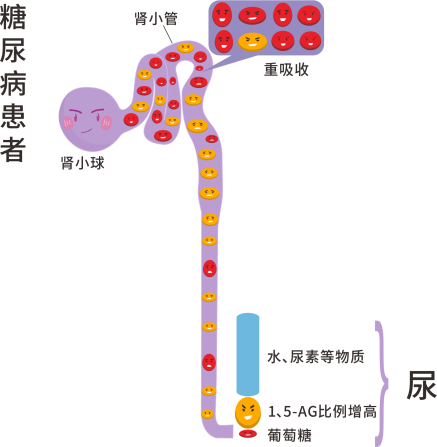 1,5-AG在腎小球中排出,卻被腎小管近99.9%重吸收【2】。這種重吸收機制與尿葡萄糖相同,當(dāng)腎小管上的尿葡萄糖過量時,則1,5-AG的重吸收就會被競爭性抑制【4,5】。糖尿病患者在高血糖狀態(tài)下終尿排泄的1,5-AG增加導(dǎo)致了血清的1,5-AG減少。