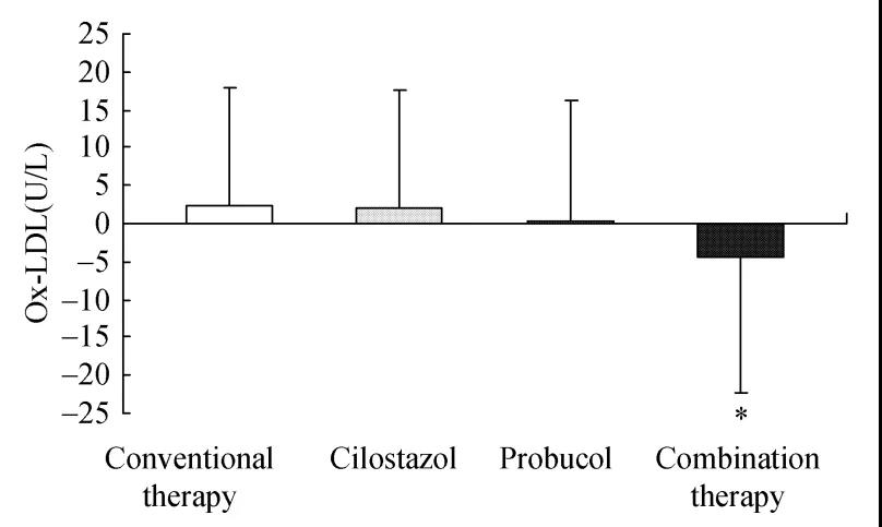 2008年10月至2009年8月在北京大學(xué)第一醫(yī)院、北京協(xié)和醫(yī)院、北京醫(yī)院、北京解放軍總醫(yī)院、北京解放軍第二炮兵總醫(yī)院的多中心臨床研究,165名年齡在40-75歲之間的2型糖尿?。═2DM)和ASO患者,隨機(jī)分配接受常規(guī)治療 (47名)、常規(guī)和西洛他唑治療(37名)、常規(guī)和普羅布考治療(43名)、常規(guī)以及西洛他唑和普羅布考的聯(lián)合治療 (38名)。治療12周后,聯(lián)合治療組(Combination therapy)的血清ox-LDL水平比常規(guī)治療(Conventional therapy)具有顯著的降低趨勢(P = 0.065),降低了4.47±17.84U/L[8]。