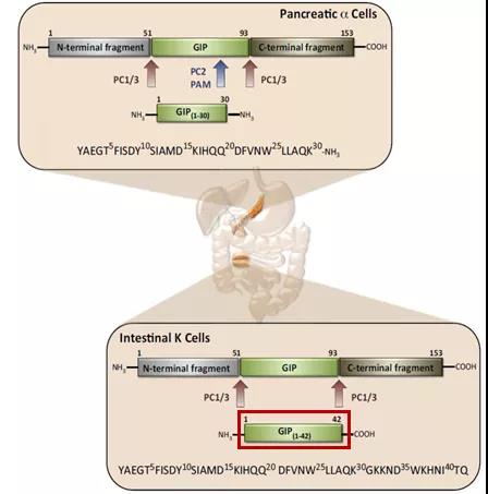 葡萄糖依賴性促胰島素多肽(GIP)是第一種被發(fā)現的腸促胰素[5-6],可分別由胰島α細胞分泌30個氨基酸GIP,但暫未發(fā)現有生物活性;由腸道K細胞分泌42個氨基酸GIP,具有腸促胰素效應[7]。