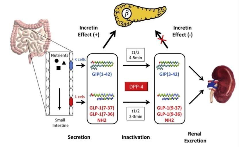腸促胰素肽(Incretin peptides)[4]是進食后由腸道的內分泌細胞分泌的激素,促進機體產生適當的餐后胰島素分泌。