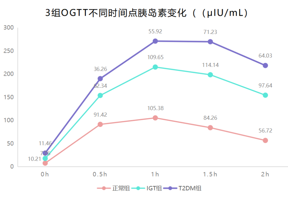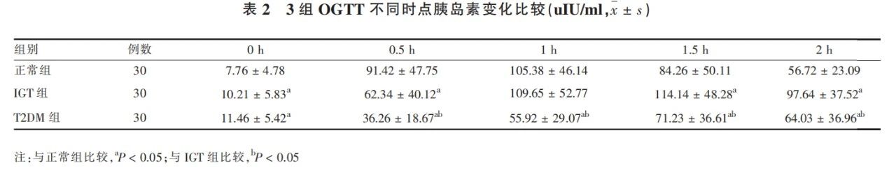 正常組胰島素平均最高值在糖負(fù)荷后1h,IGT組和T2DM組均延后,平均最高值出現(xiàn)在1.5h。T2DM組在各時(shí)點(diǎn)平均胰島素均低于正常組,在0.5h、1h、1.5h和2h的平均胰島素均低于IGT組,IGT組在0.5h低于正常組,在1h、1.5h和2h均高于正常組,差異均有統(tǒng)計(jì)學(xué)意義(P<0.05)。