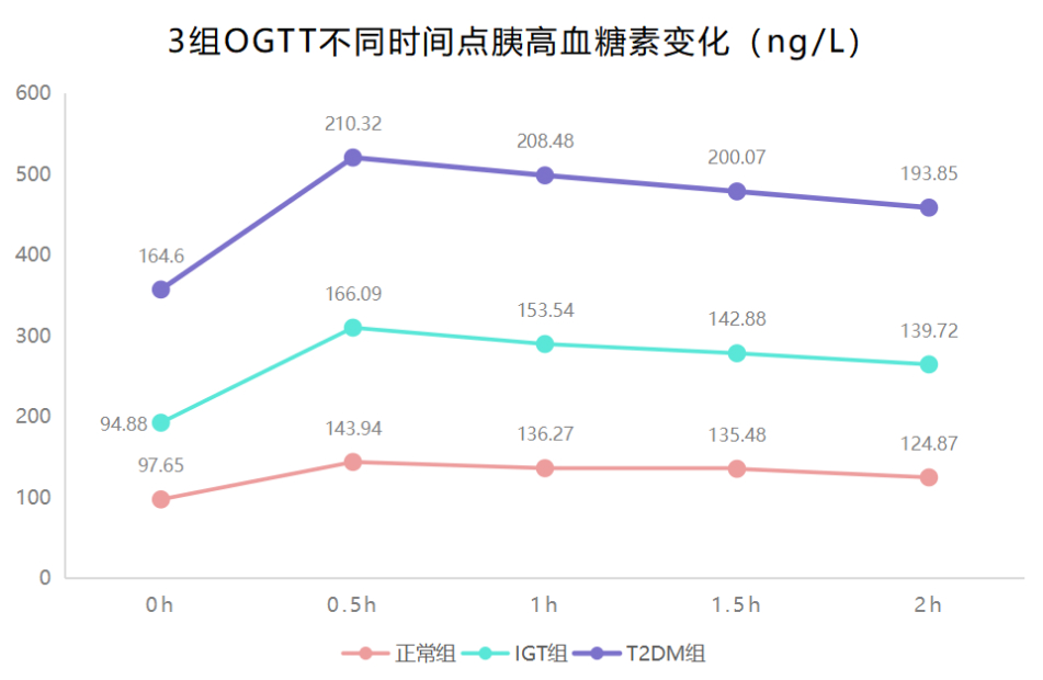 T2DM組在各時(shí)點(diǎn),IGT組在0.5h、1h、1.5h、2h的平均GLP-1低于正常組,T2DM組在0.5h、1h、1.5h、2h的平均GLP-1低于IGT組,組間差異有統(tǒng)計(jì)學(xué)意義(P<0.05)。
