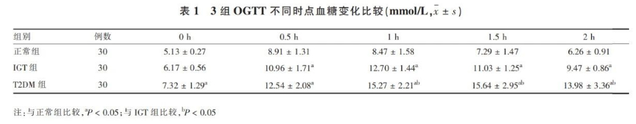 1、3組OGTT不同時(shí)點(diǎn)血糖變化如表1、圖1所示