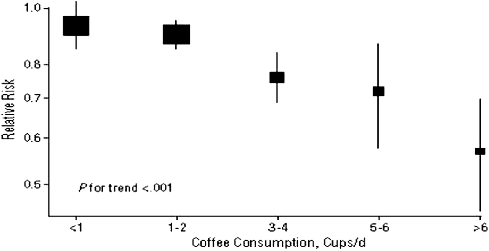 發(fā)表在ELSEVIER上的研究《Effects of Habitual Coffee Consumption on Cardiometabolic Disease, Cardiovascular Health, and All-Cause Mortality》比較了咖啡攝入量與患2型糖尿病(T2DM)風(fēng)險(xiǎn)的相關(guān)性,指出飲用咖啡量與糖尿病的發(fā)病率呈反比,每天飲用4~6杯咖啡具有提高脂聯(lián)素水平并降低胰島素抵抗的作用。